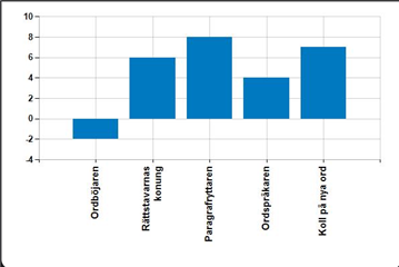 Ovanför bilden ser du upp till fem blåa staplar. Du ser de staplar du har samlat poäng inom och hur många poäng du fick inom varje område. Staplarna representerar de kategorier som frågorna inom testet berörde: Ordböjningar, rättstavning, grammatik, ordspråk och nya ord.